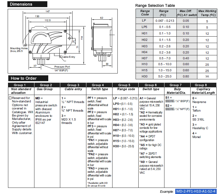 Bellow, Piston, Diaphragm; Neoprene, Teflon, Reinforced plastic, AISI 316SS, Monel |
